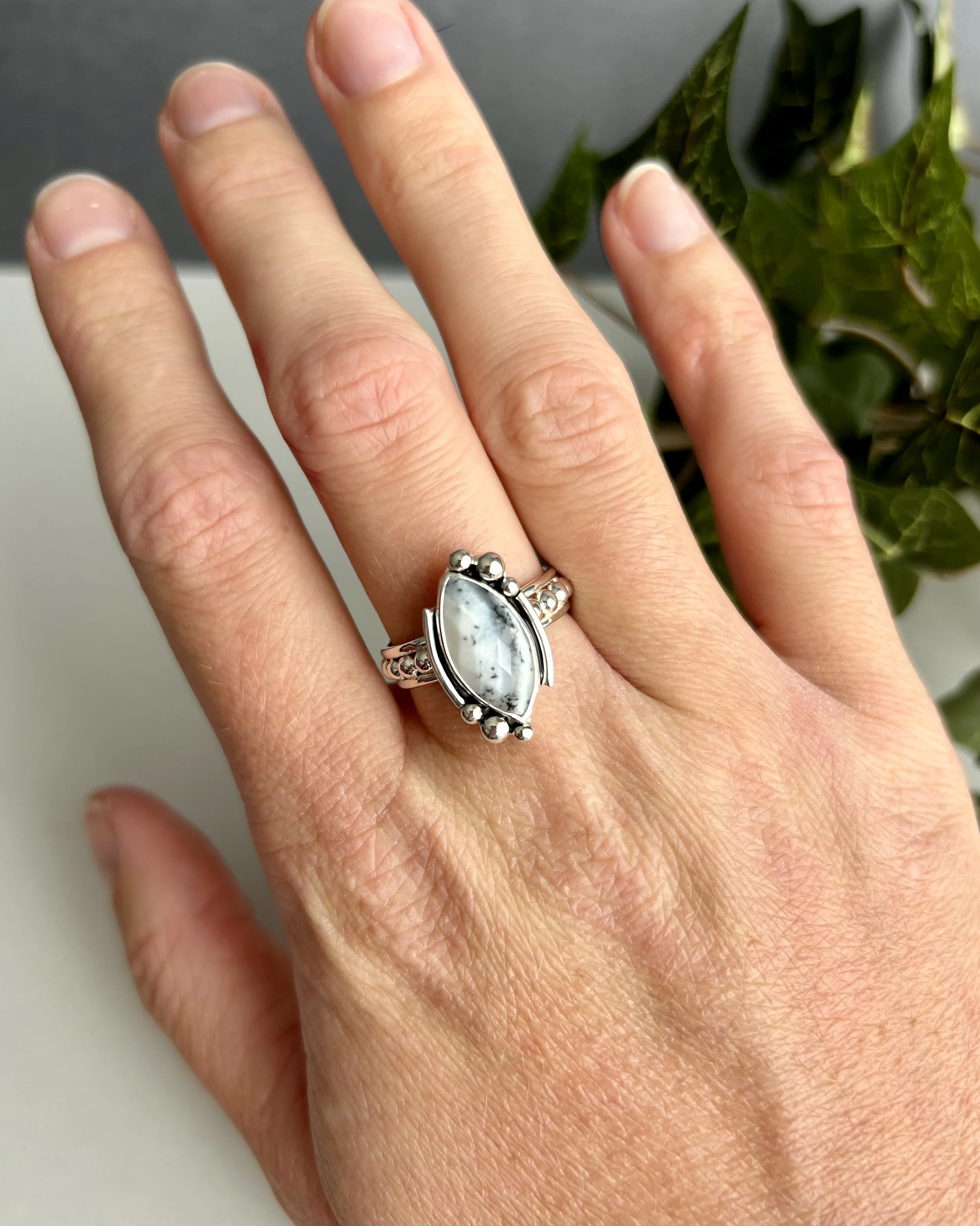 Talk about a statement ring! ✨ This sterling silver unique dot band features a rose cut marquise shaped Dendritic Agate cabochon bezel set, surrounded by silver accents that match the ring band.